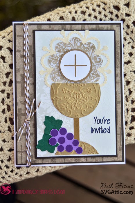 I embossed the cup and the base of the chalice and used foam tape under different pieces for added dimension. I added Krazy for Kraft and Chocolate Truffle Trendy Twines along the left side. The patterned papers I used were open stock papers from Hobby Lobby. LOVE their religious selection of papers!